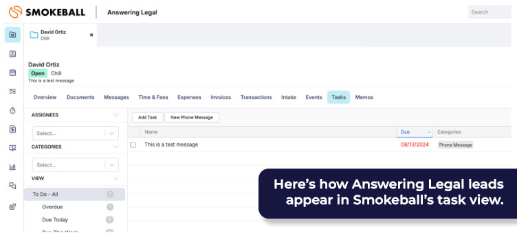 Every new client call answered by Answering Legal’s virtual receptionists will be logged in your Smokeball platform, complete with the information gathered via legal intake. From there, you’ll be able to handle the lead according to your usual workflow, whether that means a follow-up call, a quick email, or some background research on your end.