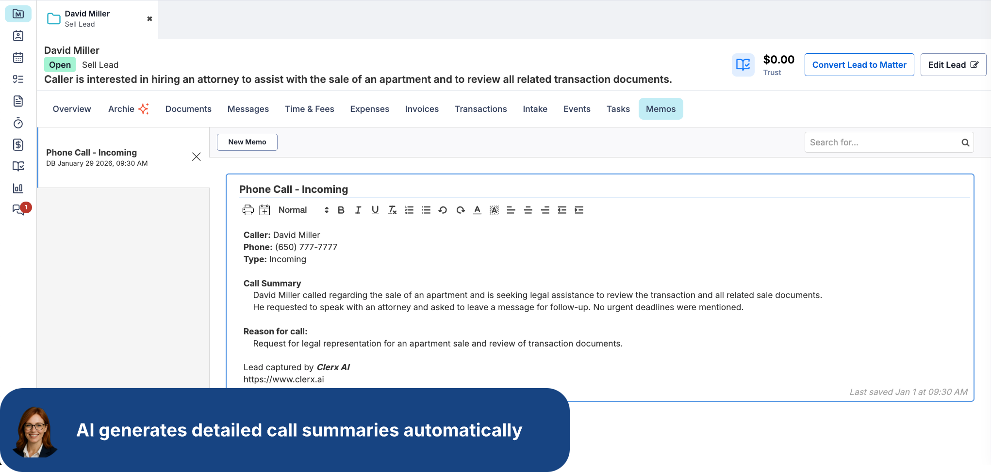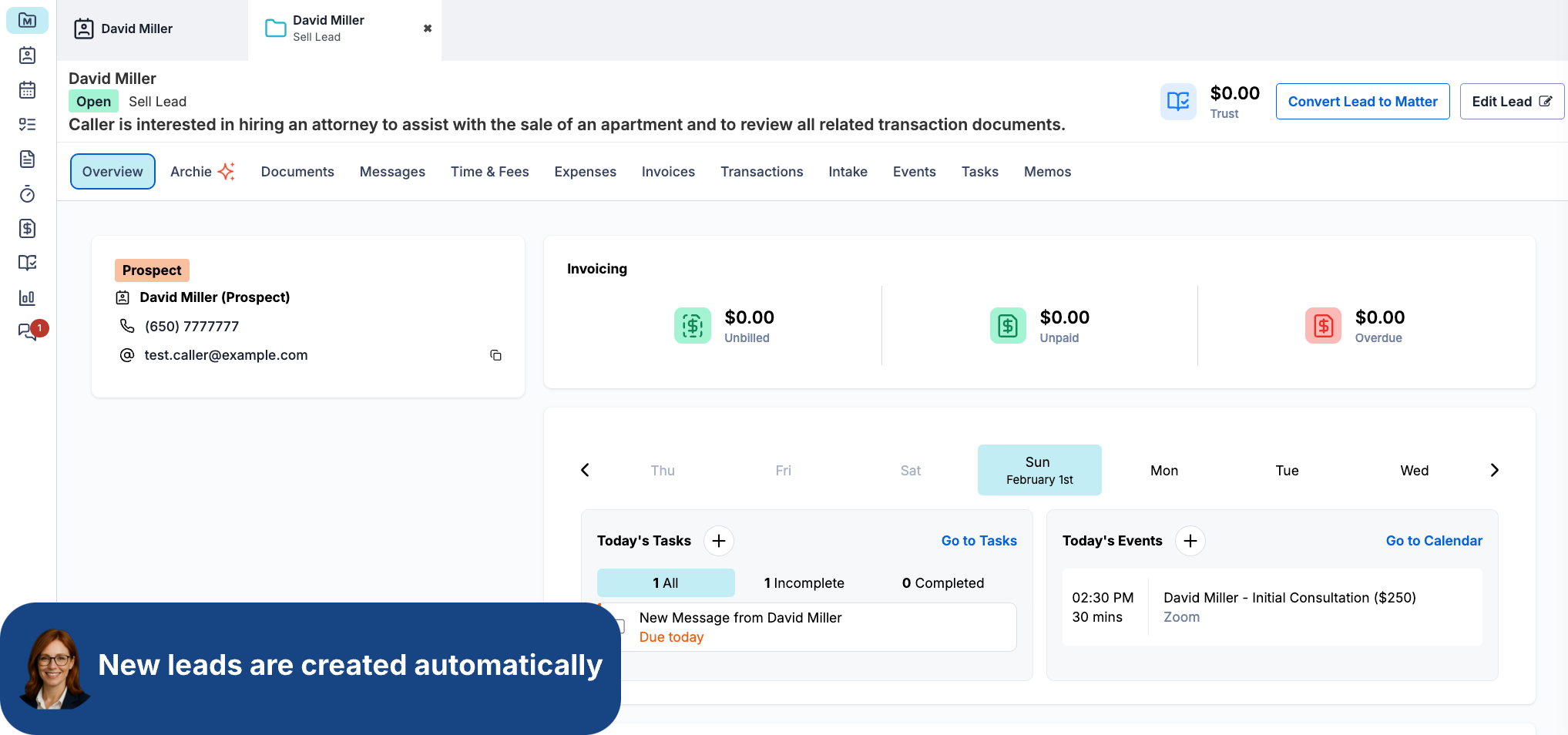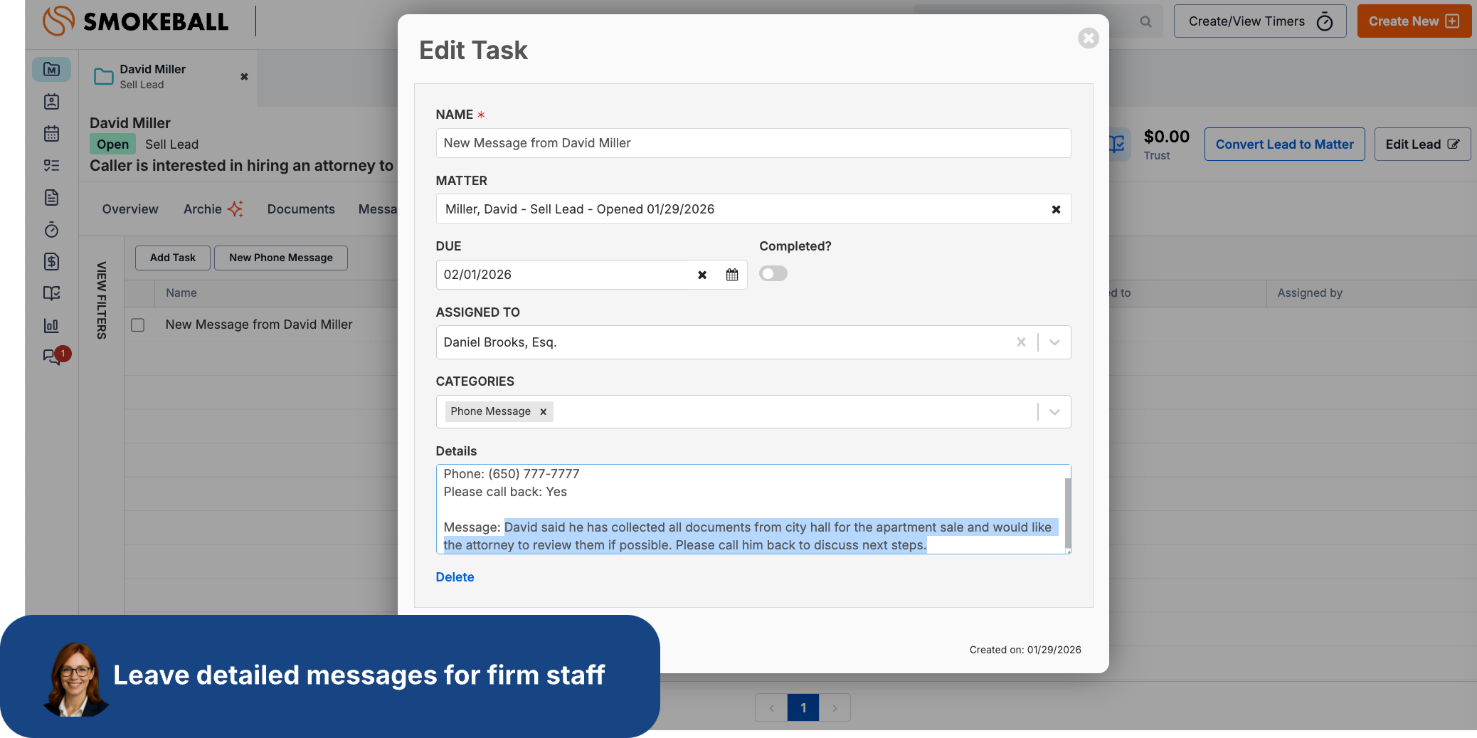 New Leads, contacts, call summaries, notes, and appointments are automatically pushed into Smokeball - keeping everything accurate and eliminating intake guesswork.