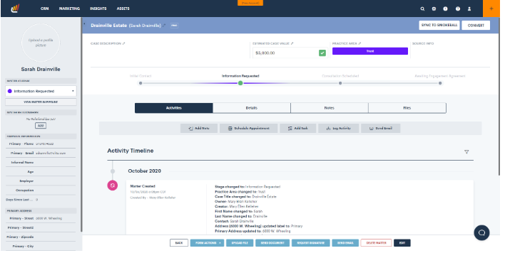 Our software for lawyers enables you to not only connect with new clients, but re-engage with your collected database of past clients with law firm marketing automation. With this feature you can keep your firm at arm’s reach for them when a new opportunity arises. Workflow automation for law firms is the simplest way to create a new stream of revenue!