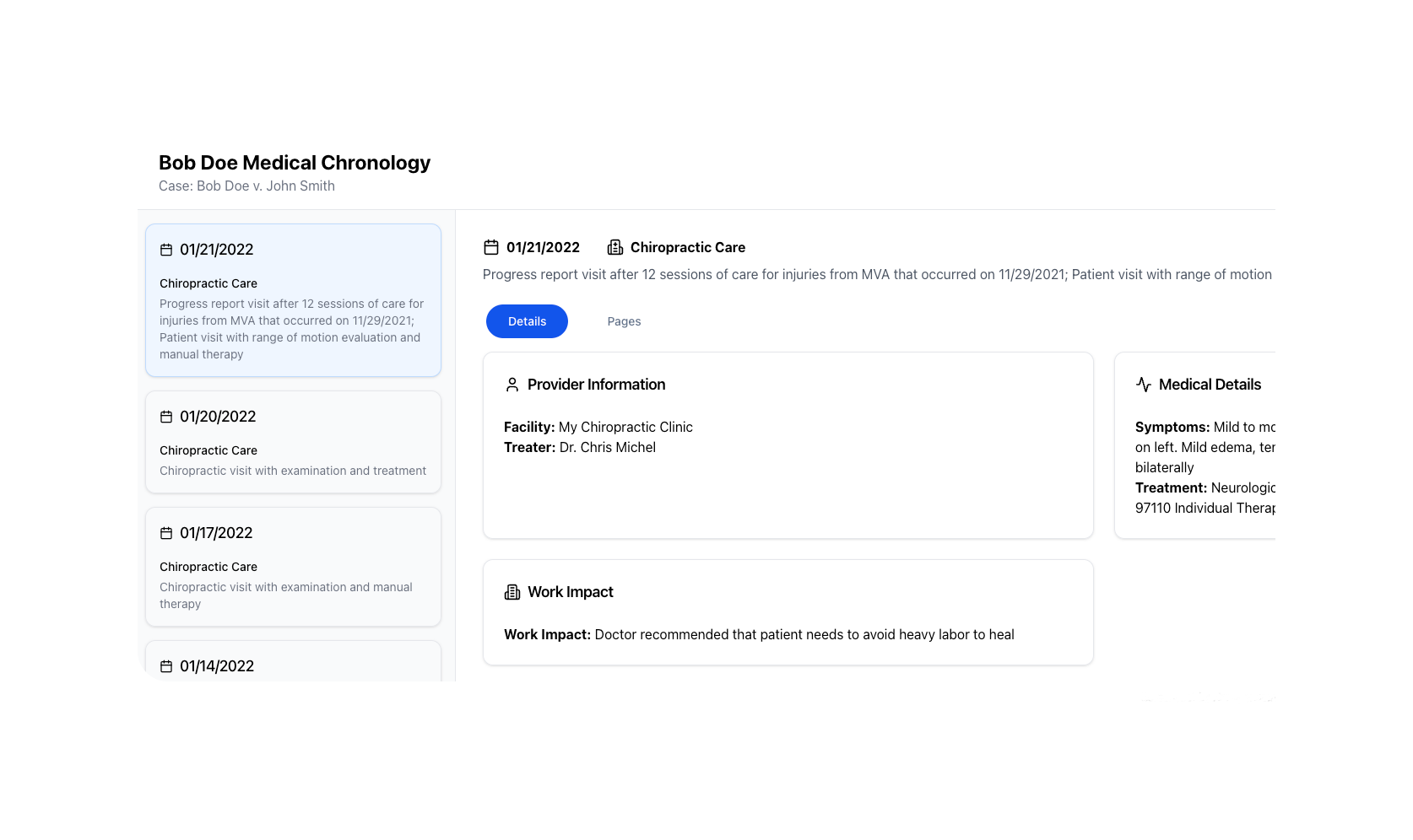 AI-powered medical chronology creation that turns thousands of medical records into organized summaries quickly.